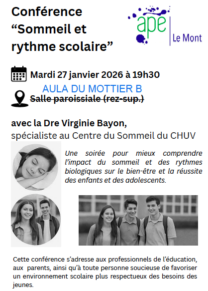 A l’invitation de l’association des parents d’élèves du Mont, la Dre Bayon, médecin associée au Centre d’investigation et de recherche sur le sommeil du CHUV, propose une conférence intitulée « Sommeil et rythme scolaire ».